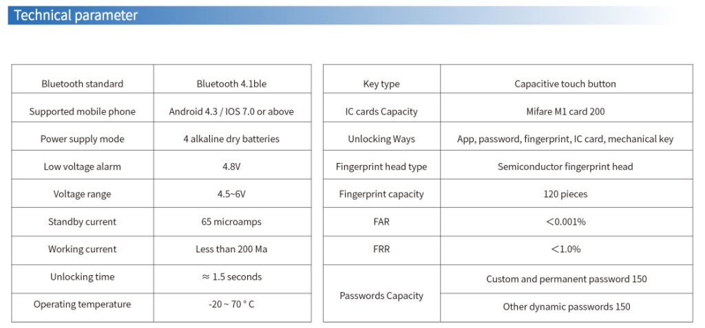 Unlock type: fingerprint/ password/IC card/key/Bluetooth/APP